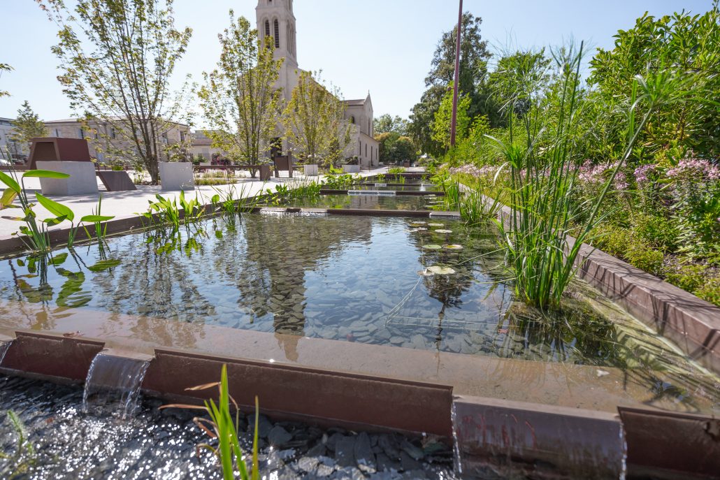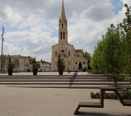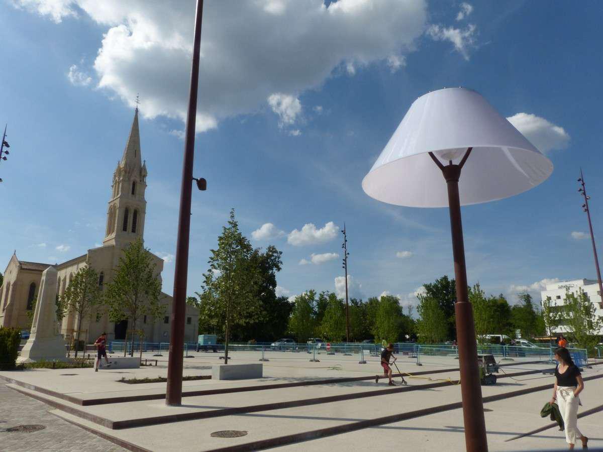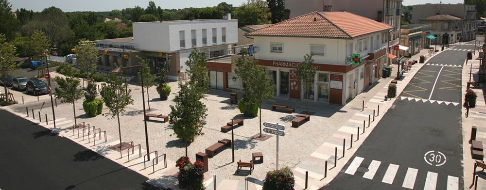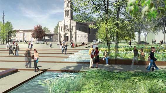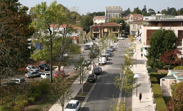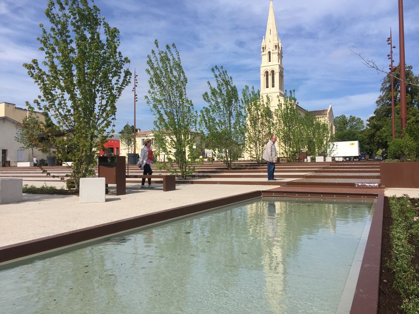 Avant les travaux, la place Bernard Roumégoux, le point central de la ville, abritait un parking. Elle est désormais profondément transformée : plus aucune voiture n’est stationnée, des arbres ont été plantés un peu partout et un canal créé de toute pièce borde un côté de la place. « C’est agréable de pouvoir cheminer, de pouvoir apprécier les arbres et de ne pas slalomer entre les voitures« , remarque une habitante.