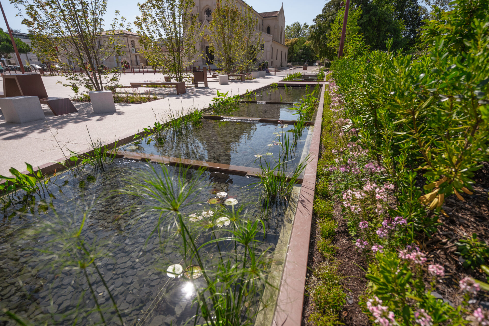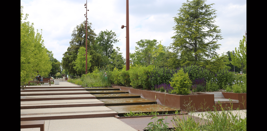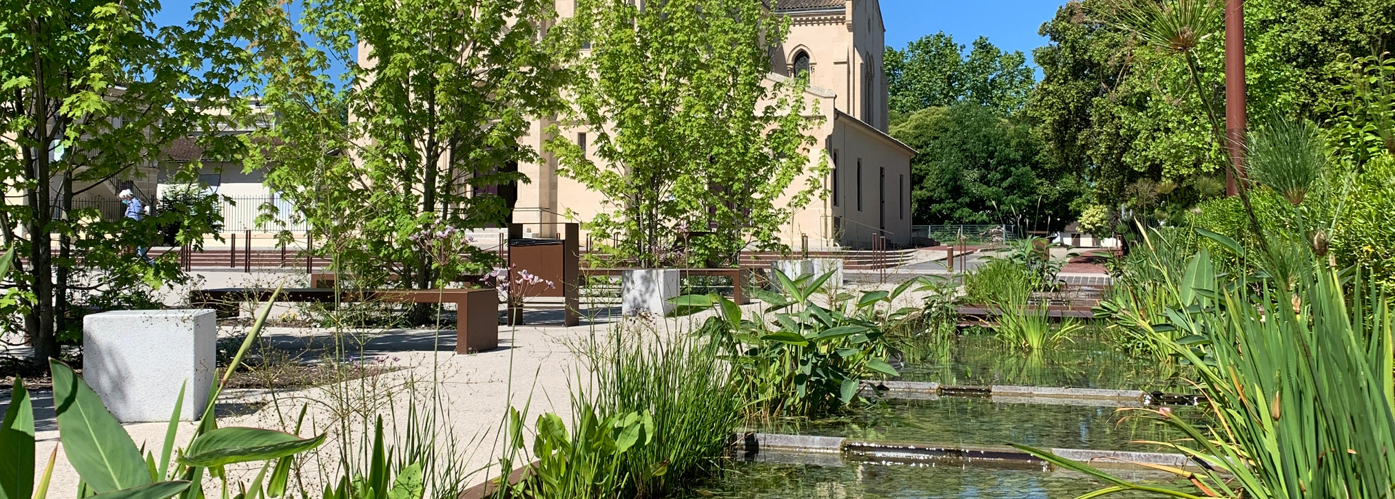 Type d’aménagement : Plantation, arrosage, paillage, bassin et mobilier.